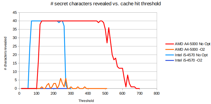 I'm running on a mac os x 10.13.2 , and I was able to get the secret with a cache threshold as low as 40, But that is not the reason for this post, I installed the fix apple released today that is ment to fix this issue but I still can use this to get the secret, https://support.apple.com/en-au/HT208397 That is the link to the Security Update that said will fix spectre but it has not. |
