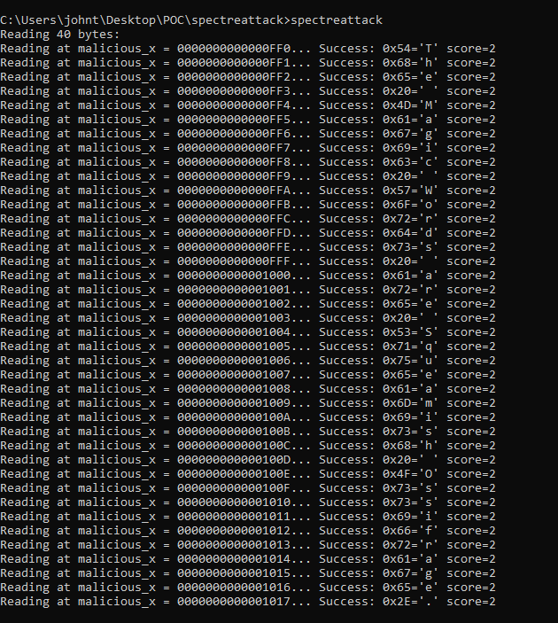 What you say is correct, but I don't think my postings challenged them. If it appeared that way, my dearest apologies... Spectre Attacks (in research paper) can be Inter-Application (not necessarily targeting the kernel directly). Windows Updates are not restricted to OS Fixes. Firmware Updates can address some forms of attack. Software Patching (especially Signature Identification) can address immediate concerns. Is this going to stop Spectre Attacks, completely? Absolutely not (as the research paper alludes to). New Processor Designs eventually should... ... I would never say this code is reading kernel data. I mentioned it attacks itself as a demonstration. What we do know at this time, is that to start guarding against these forms of attacks (short of a new processor design), there will be much CPU overhead, and that overhead will depend on your current processor. I've read reports that some machine slowdowns as much as 30% may occur, with such solutions as speculation fencing, and that is what we have to look forward to, in the near future... Intra-Application Spectre Attacks address the core flaw in Processor Design. Let's hope we can work together to protect against Spectre until machines/boxes get replaced due to attrition, etc. |