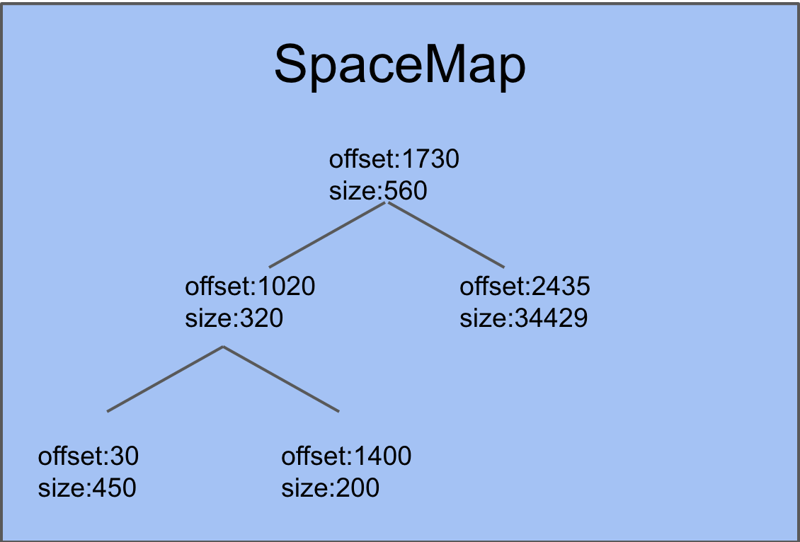 与 raft-engine 写入到 append-only 文件的末尾不同,ng-raft-engine 中通过 SpaceMap 对 BlobFile 中的空余空间进行复用。在复用空间的情况下,写 BlobFile 只需要 fdatasync,而可以省去 sync metadata 的开销。SpaceMap 以红黑树的形式,以空闲块 (FreeBlock) 在 BlobFile 内的 offset 为 key,以空闲块的大小为 value。