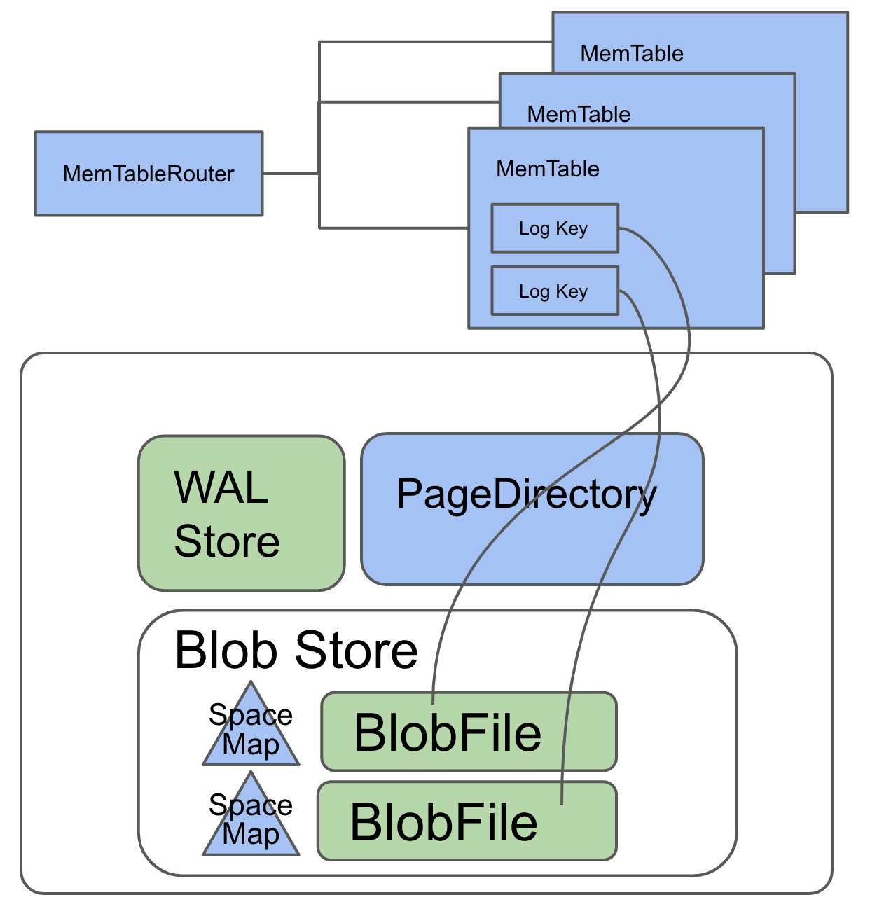ng-raft-engine 整体的架构如下。PageDirectory 是一个内存中的 ordered_map,存储着 PageId 到硬盘上 BlobFile 的物理位置。每个 SpaceMap 管理硬盘上的一个 BlobFile。多个 SpaceMap 及其对应的 BlobFile 作为 BlobStore。所有写入、删除 PageId->PageEntry 的操作都会记录在 WALStore 中。