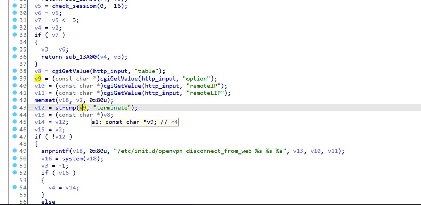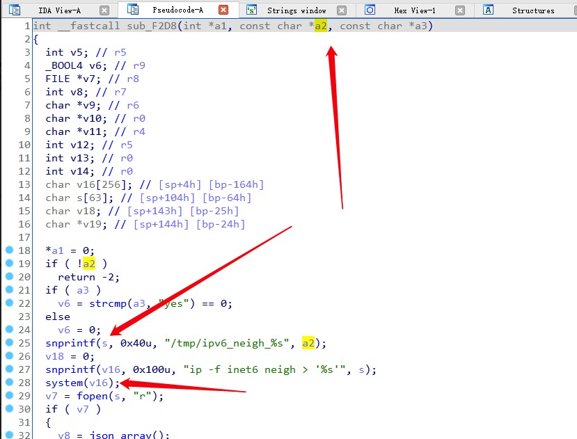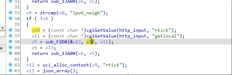 "rtick" is from "http_input", and further passed to "sub_F2D8". In "sub_F2D8", "rtick" is concatenated to "/tmp/ipv6_neigh_", then passed to "system", causing command injection.