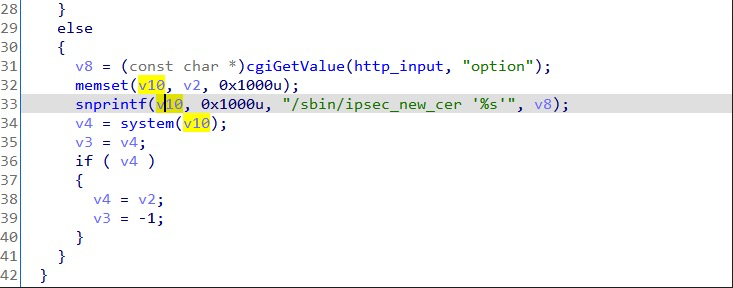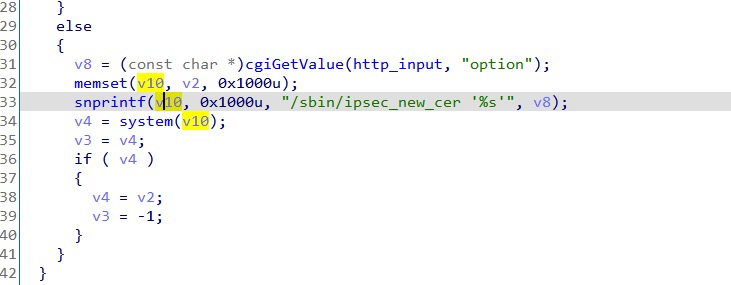 The value of "option" is from "http_input",and will be spliced with "/sbin/ipsec_new_cer" , may cause command execution