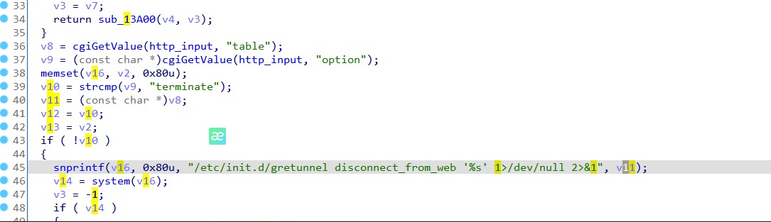 The table value will be spliced with "/etc/init.d/gretunnel disconnect_from_web '%s' 1>/dev/null 2>&1" , may cause command execution