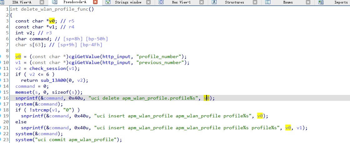 The value of "profile_number " is from "http_input" and will be spliced with "uci delete apm_wlan_profile.profile", may cause command execution