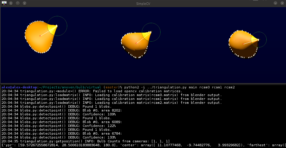 From each of these perspectives the software would have to determine the centroid of the bulb and possibly the tip. Given the 6 projections of those 2 points I was able to triangulate the position of them in 3d space. Resulting in the position(triangulated centroids) and orientation(centroid-tip).