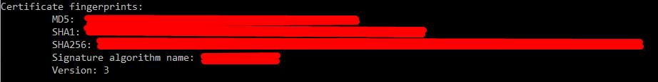 keytool -list -v -keystore {LOCATION ./app.keystore} -alias {ALIAS NAME} -storepass {STORE PASS} -keypass {KEY PASS}Output:
