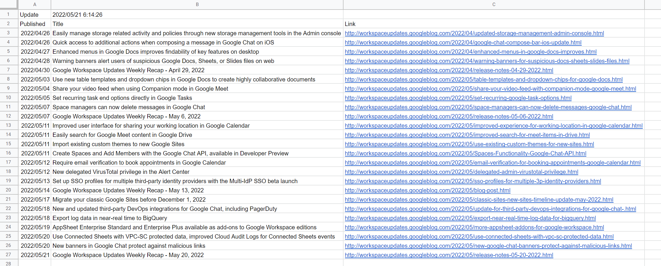 This is a sample script for retrieving and parsing the XML data from Google Workspace Update Blog and putting it to Google Spreadsheet using Google Apps Script.