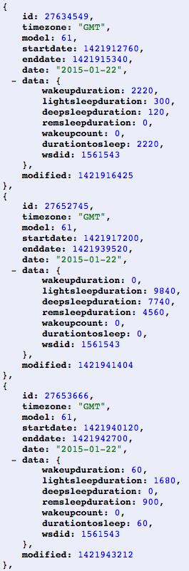 Sometimes we assemble a query for startdate (which needs to be formatted as a time in epoch seconds, for sleep detail measures) and sometimes for startdateymd (which returns a starttime in epoch milliseconds for sleep summary measures). Some measures return device identifiers: a model 16, for example, is their Pulse watch, and a model 32 is their Aura bedmat. What then am I to make of a sleep data object reporting a model 61??