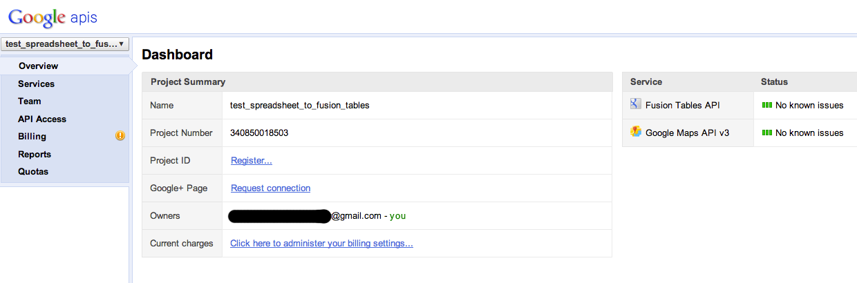 I'm almost ready to make this happen, but I'm going to need one other piece of information - a Google Fusion Tables API key. I need to turn on access to the Fusion Tables API in Google's API console, and get an authentication key. Don't worry, this is much easier than it sounds.