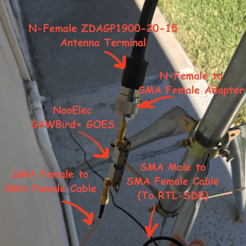 [Antenna] --- [Adapter] --- [(input) SAWBird+ (output)] --- RTL-SDR (with Bias Tee)] --- [Raspberry Pi]