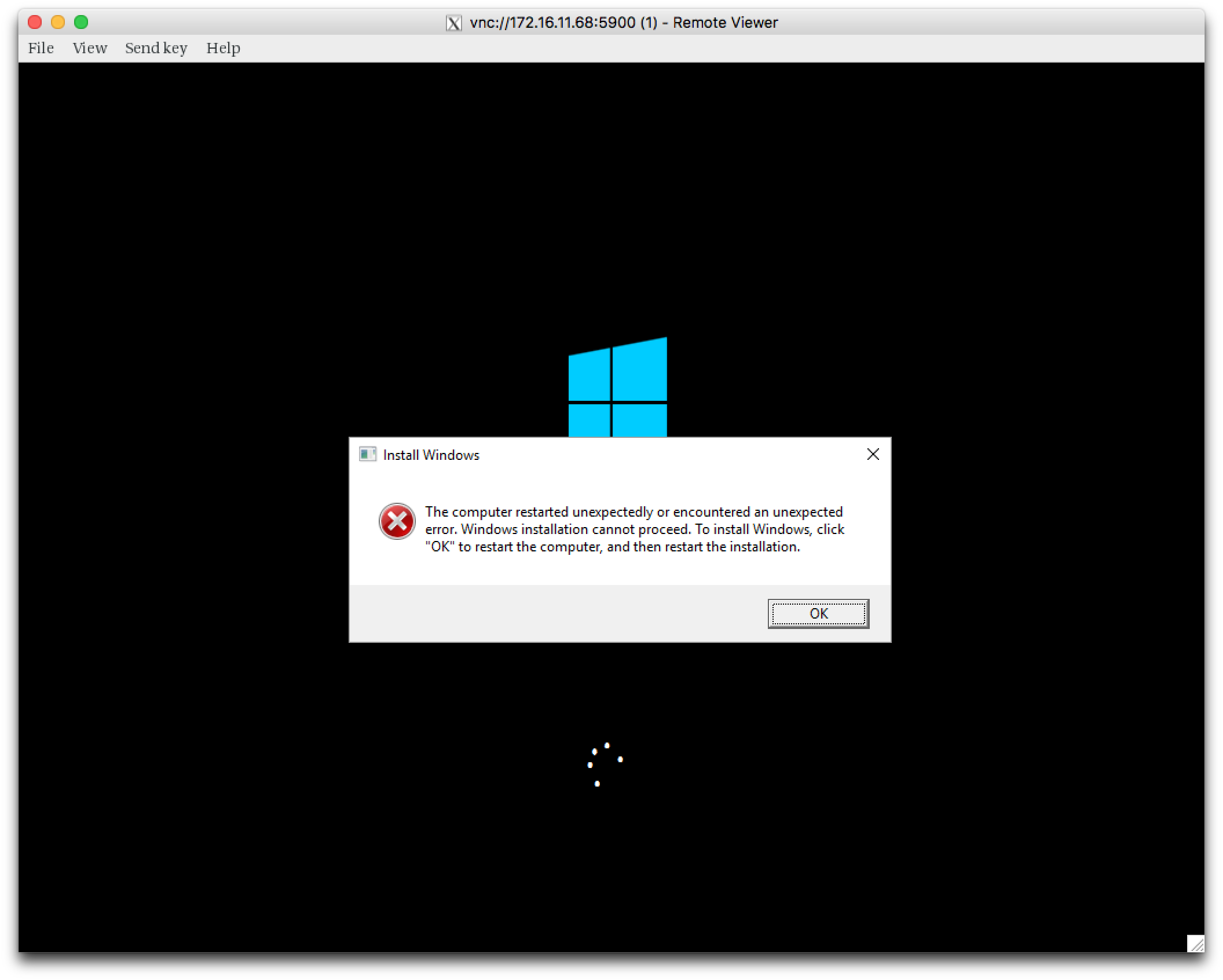 After reboot it returns with the following message: "The computer restarted unexpectedly or encountered an unexpected error. Windows installation cannot proceed. To install Windows, click OK to restart the computer, and then restart the installation.":