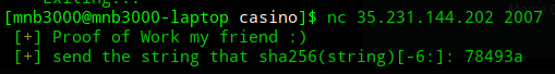 So, as we connect we see a little proof of work prompt (actually this was a preety useless PoW, because it doesn't require any prefix in our string, so we could just precompute all possible sha256 hashes with different 6 chars at [-6:], but still it took around a minute on my laptop :D)