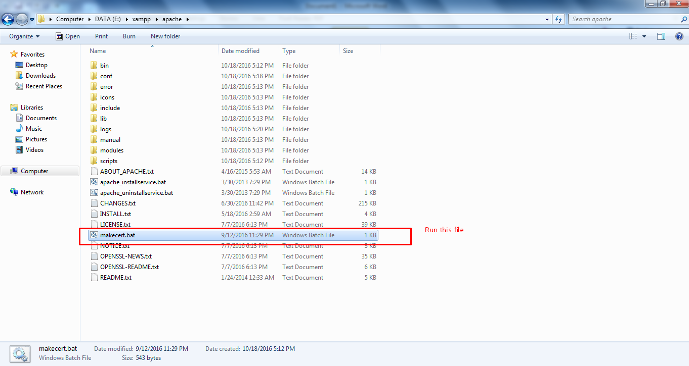 • Go to your XAMPP installation directory (in my case it’s E:\xampp), figure out apache folder. In this, find & run batch file named makecert.bat