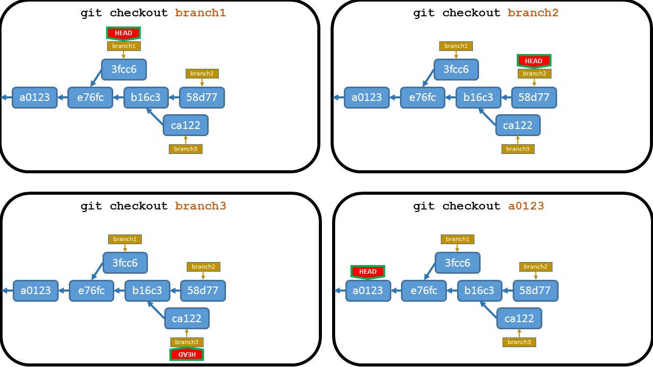 As you can see, the HEAD points to the target of the git checkout command — to a branch (first 3 images of the quadruplet), or (directly) to a commit (the last image of the quadruplet).