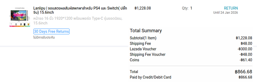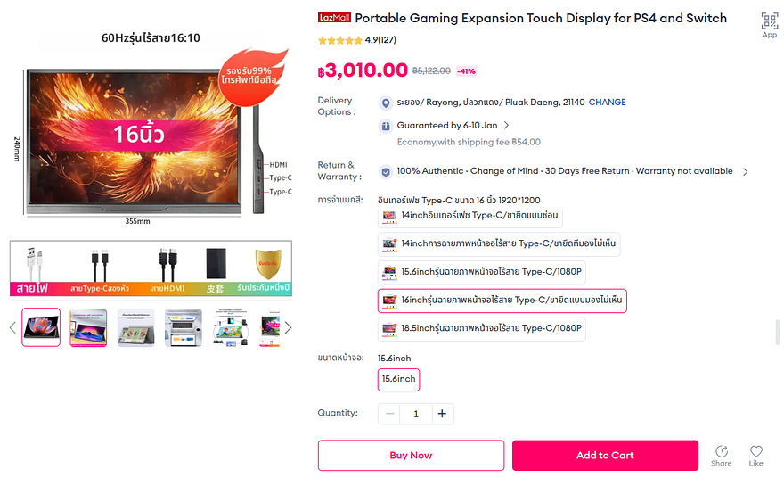 ผมไปเจอสินค้าน่าสนใจใน Lazada ชื่อยาวเหยียดว่า "Lanlipu | จอแสดงผลสัมผัสพกพาสำหรับ PS4 และ Switch( ปลั๊กจีน) 15.6inch" (ลิงก์สินค้า) มันมี option ให้เลือกตัวสินค้าเป็นสิบเลย โดยผมเลือก option ในการสั่งซื้อเป็นตัวนี้ "หน้าจอ 16 นิ้ว 1920*1200 พร้อมพอร์ต Type-C รุ่นยอดนิยม, 15.6inch"