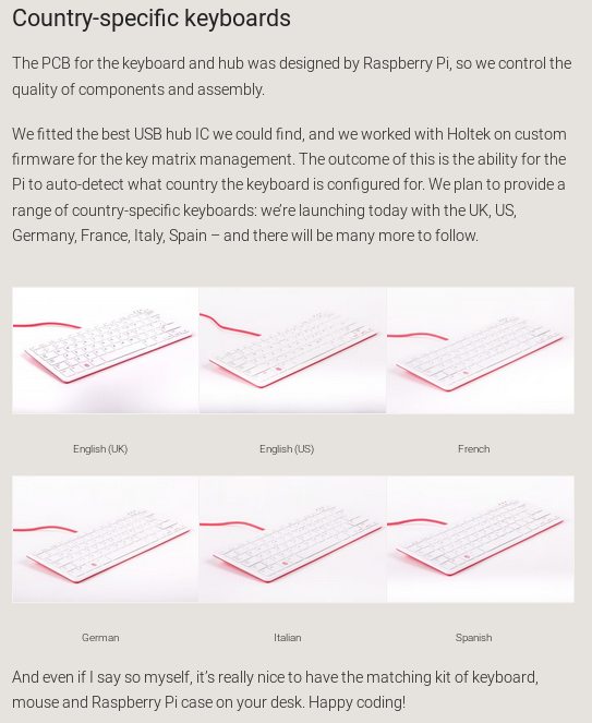 In a marketing text, it is stated that Raspberry Pi Trading Ltd. "worked with Holtek on custom firmware for the key matrix management. The outcome of this is the ability for the Pi to auto-detect what country the keyboard is configured for".