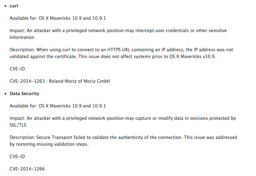 Interestingly, this does not work for mismatched hostnames – https://213.133.107.227.xip.io/ fails even though https://213.133.107.227/ is accepted. I'm now somewhat curious as to what could have produced that particular failure mode but presumably it wasn't noticed because Safari does its own checks and the QA team obviously doesn't test either this case or the lower-level OpenSSL functions directly.