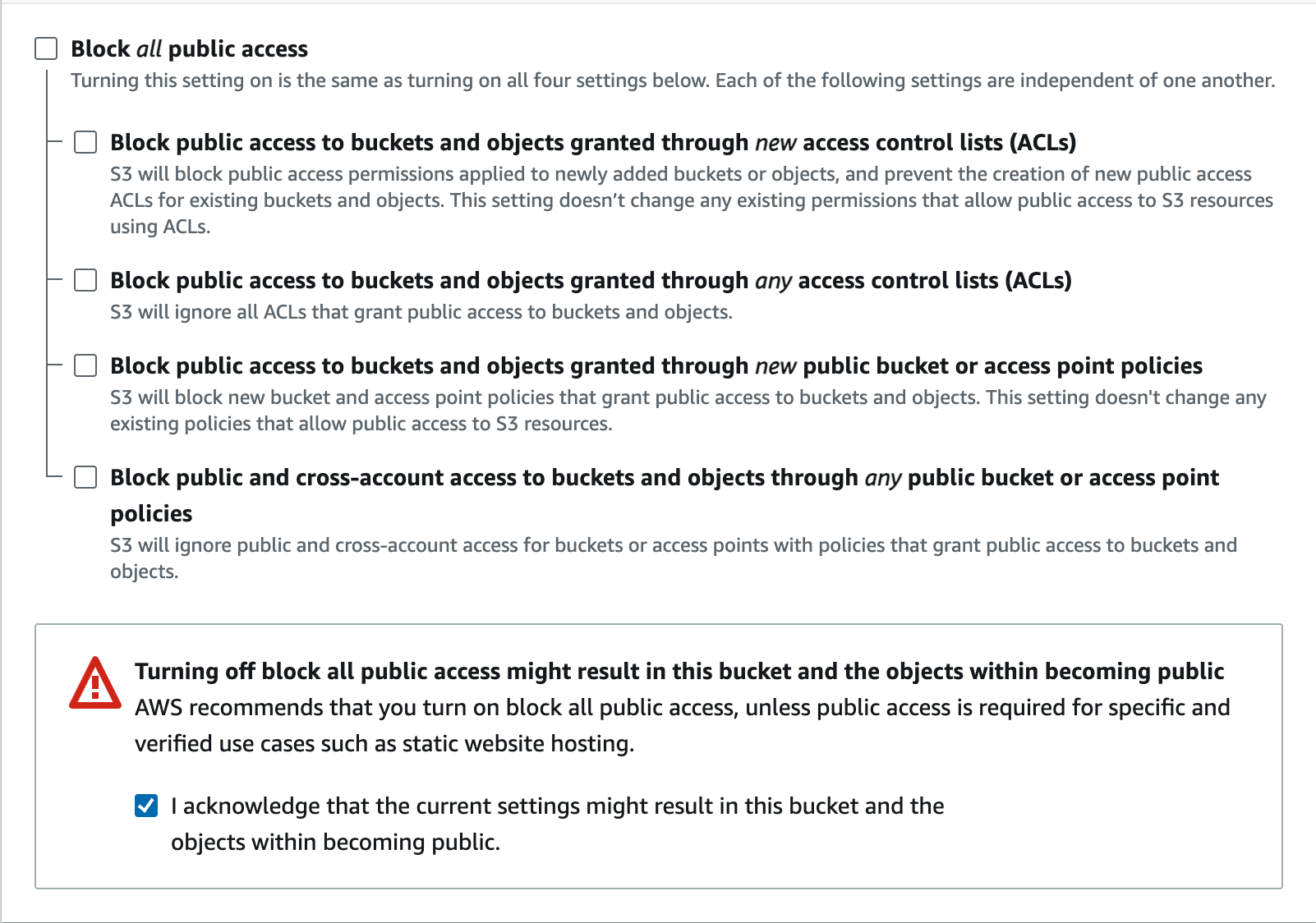 - Uncheck the "Block all public access" and check the acknowledgement.