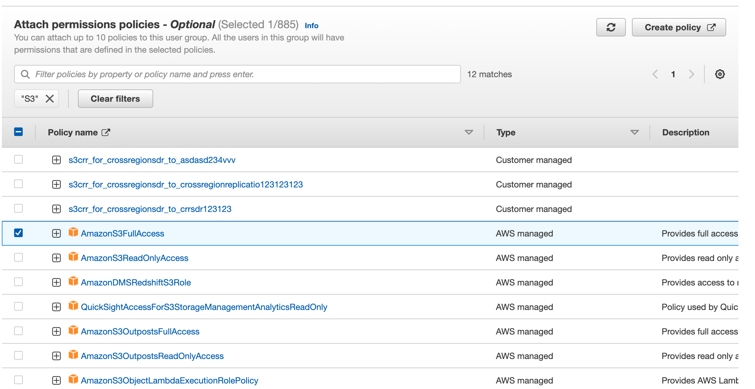 - Check the box next to "AmazonS3FullAccess" and click the "Create group" button on the bottom.
