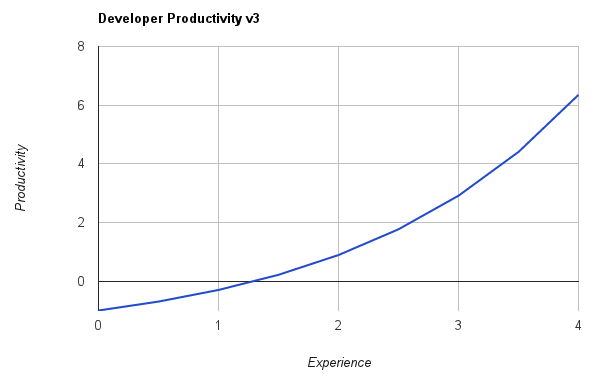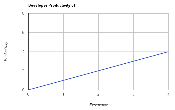 This was a pattern that was to repeat itself, and it took me a while to understand why. Back in my early days in the IT industry I assumed that experience and productivity were related by a linear function like: productivity = (experience) times a constant: let's call it 'a', giving us: