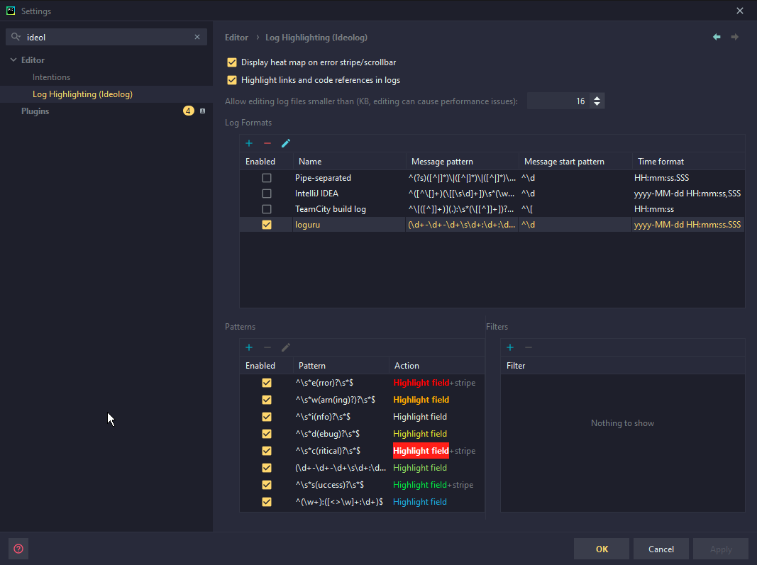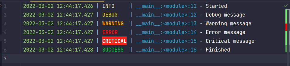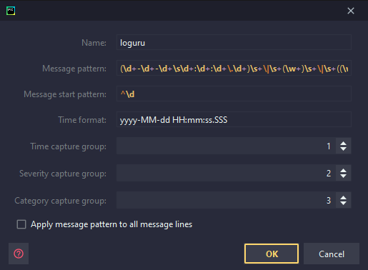 Simple Ideolog settings to work with the python loguru library Sadly there is no convenient way to import/export Ideolog settings, so I will just have images and regexes in here. How it looks Image of the settings Details Message pattern: (\d+-\d+-\d+\s\d+:\d+:\d+\.\d+)\s+\|\s+(\w+)\s+\|\s+((\w+):([<>\w]+:\d+))\s+-\s+(.*)$