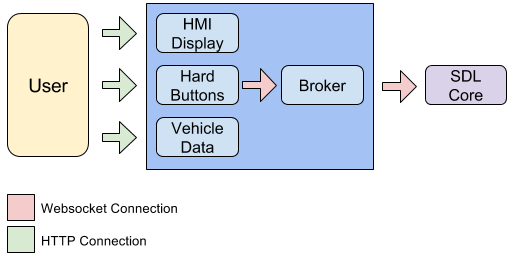 The following architecture shows how multiple Generic HMI components, each with their own websocket connection, can share SDL Core's single websocket connection through the use of a Broker.