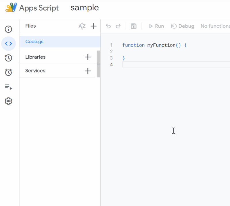 This sample script is used for storing the current Google Apps Script project in a database of history. Please copy and paste the following script to the “Client” file.