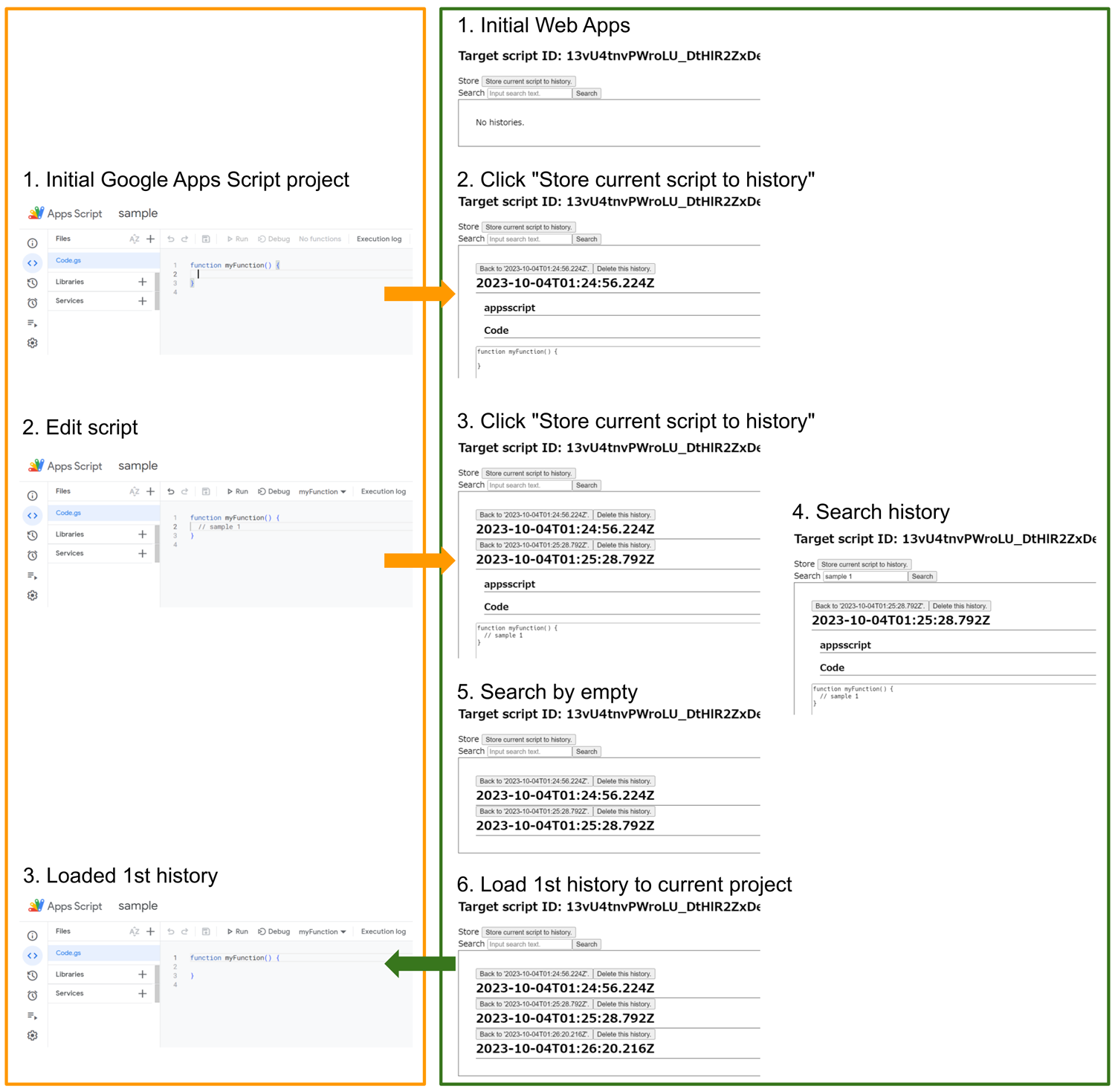 When you access this URL using your browser, an HTML page for managing the history of scriptId is opened. An image indicating the sample flow is as follows. The left and the right squares are the client Google Apps Script project and the HTML page, respectively.