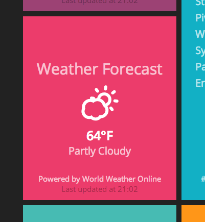 A Dashing widget to display weather information using World Weather Online API and Skycons. Live here.